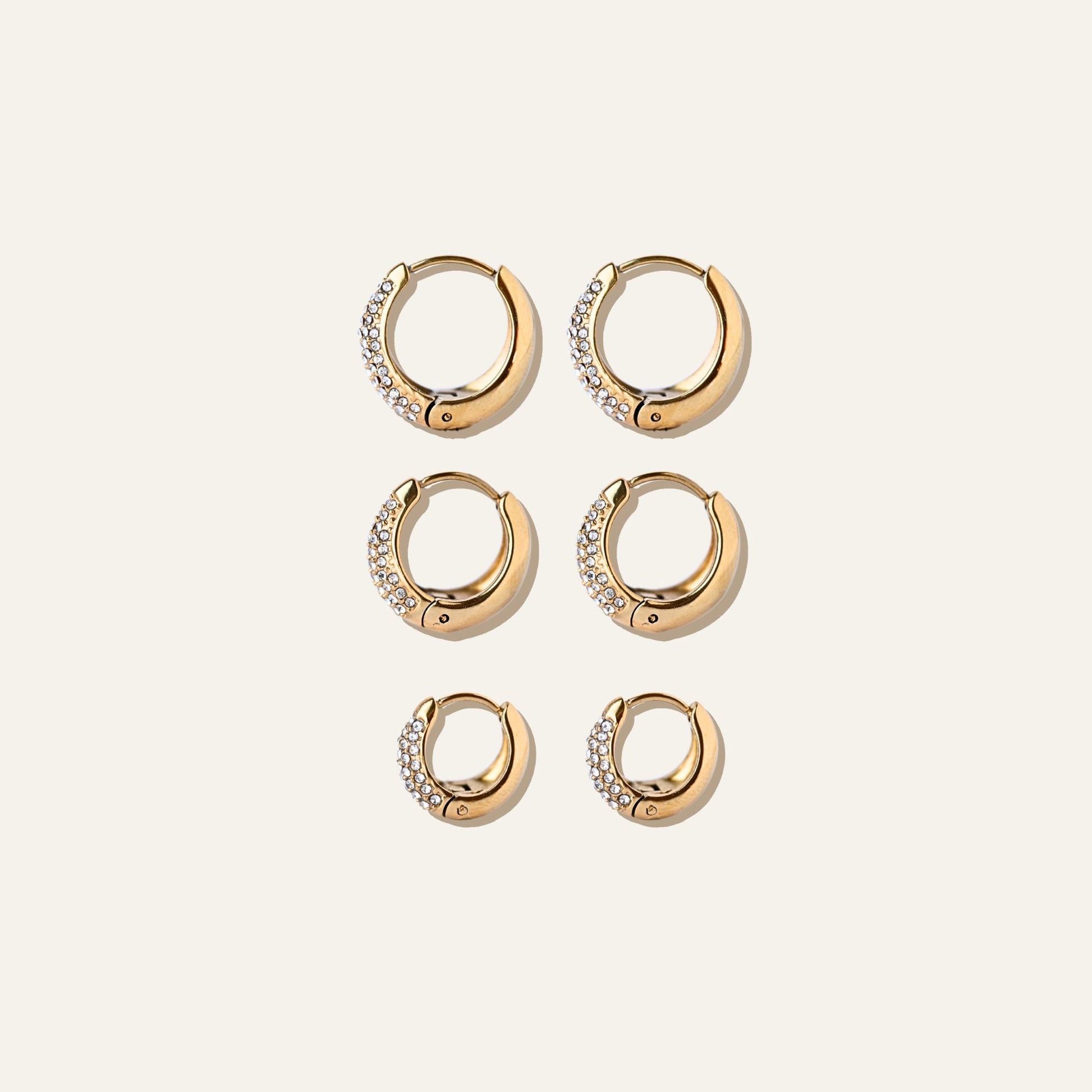 3-Pack Crystal Dome Hoops represents the pinnacle of luxury in our collection. Designed to command attention, each hoop features a bold, rounded silhouette lavishly encrusted with shimmering zirconia crystals. The set includes three distinct sizes, allowing you to create the ultimate ear stack. Wear all three together for a powerful statement look or style them individually for a sophisticated touch of glamour.