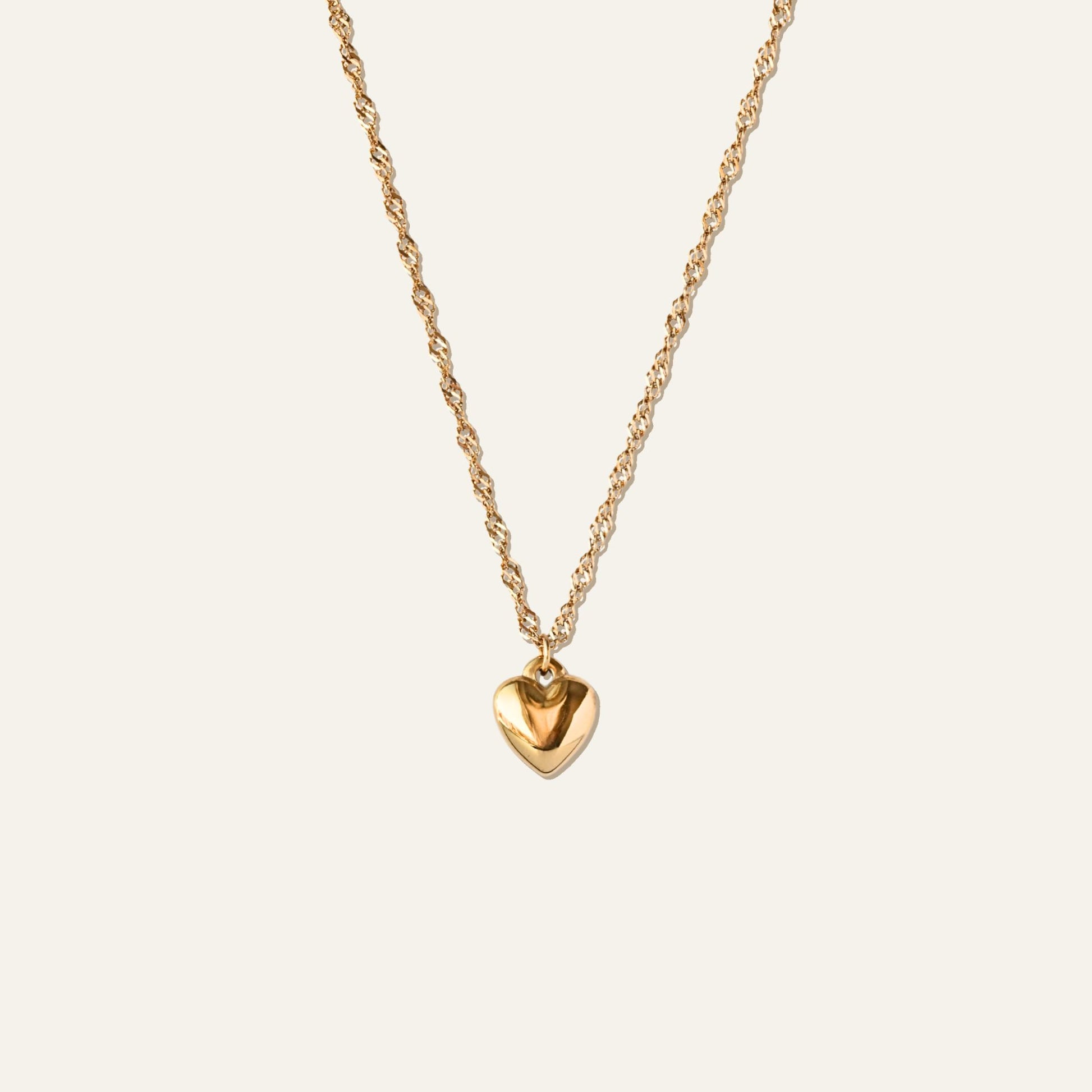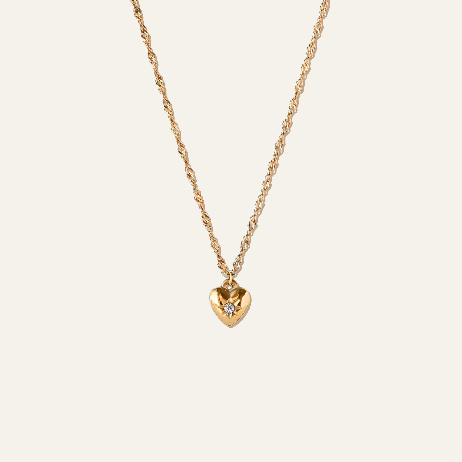 Everyone needs Nori's Vintage Heart Necklace in their jewelry collection. The necklace features a twisted chain and an elegant heart pendant with a zirconia crystal in the center.