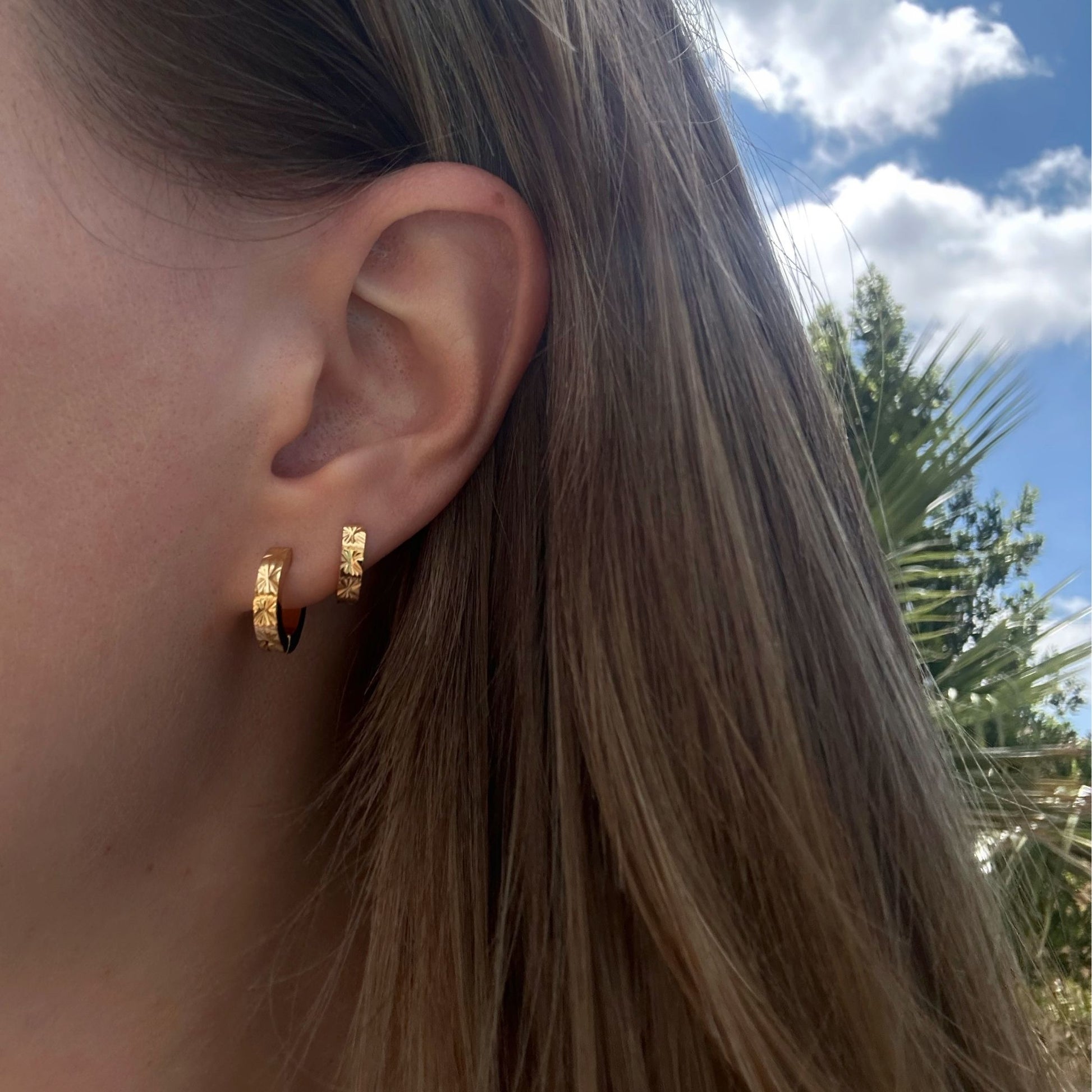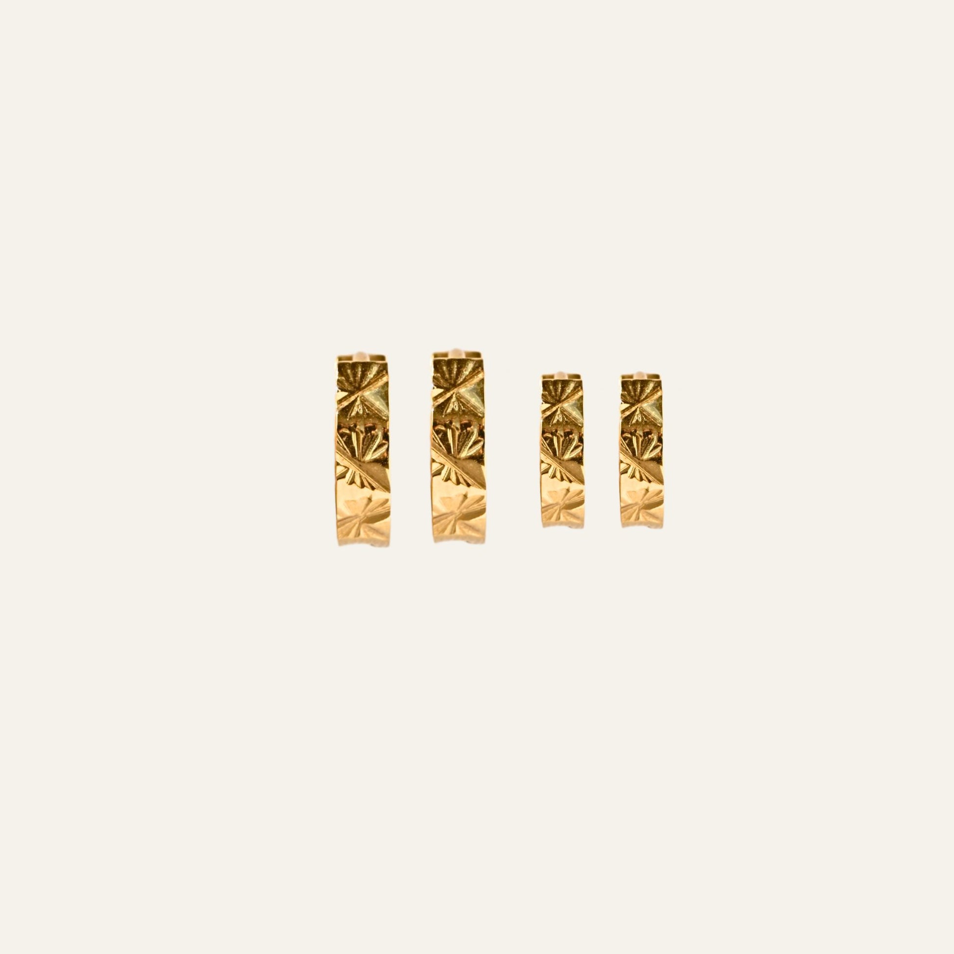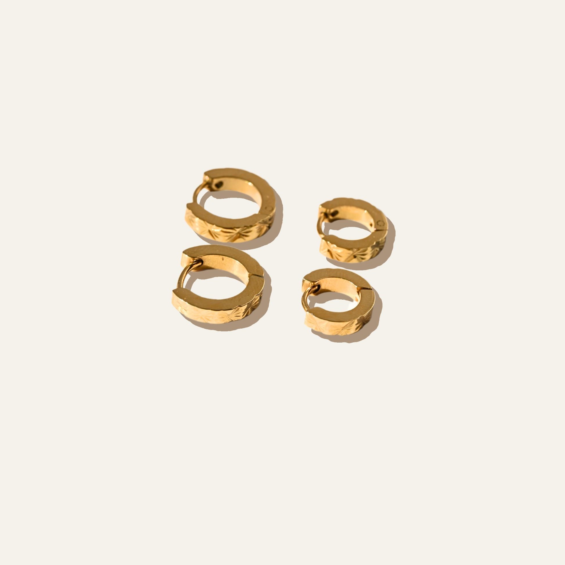2-Pack Minimalistic Sun Huggies består av två par örhängen i olika storlekar. Varje huggie har små graverade solmotiv som ger textur och en fin glans. Perfekta som vardagssmycken eller att mixa och matcha med andra favoriter.