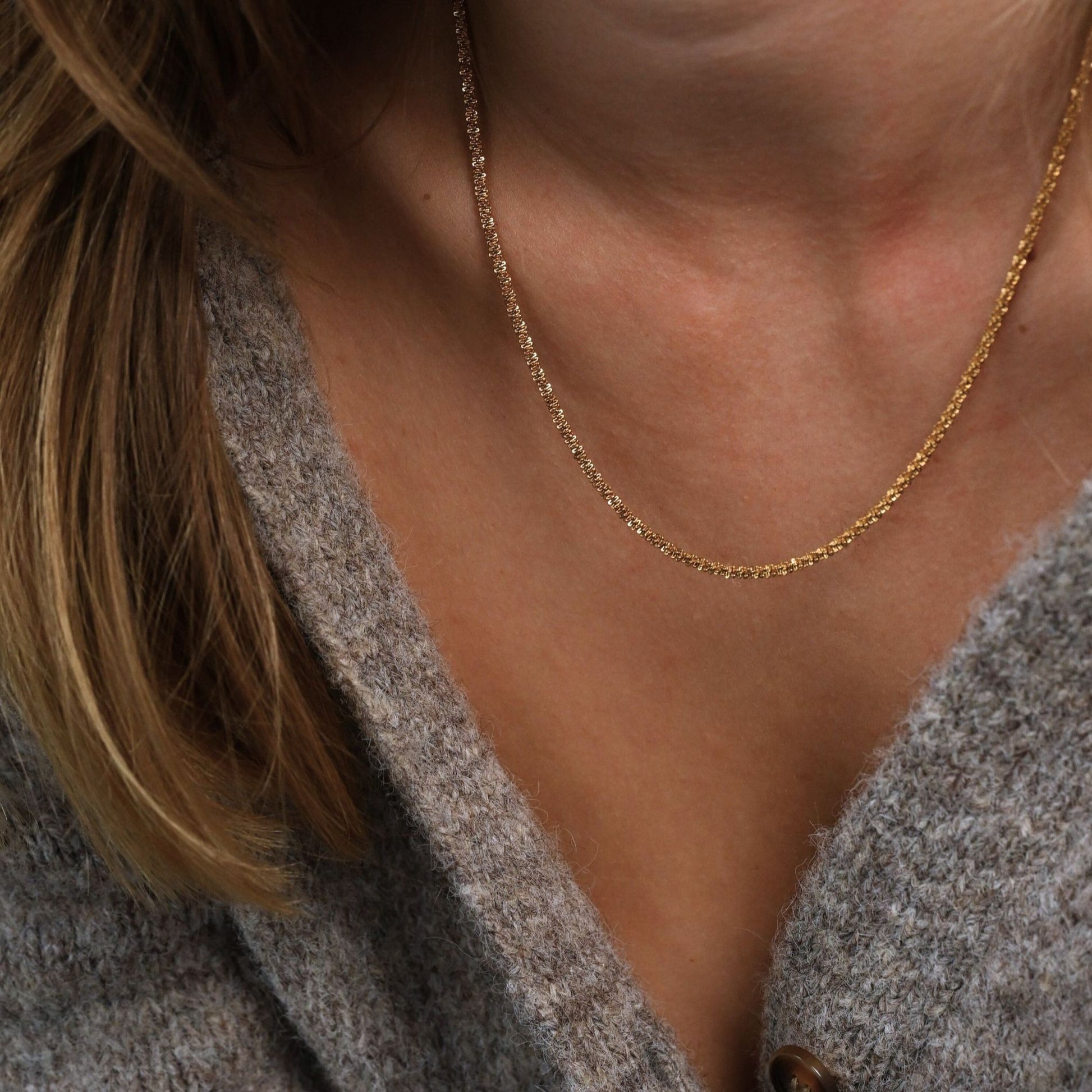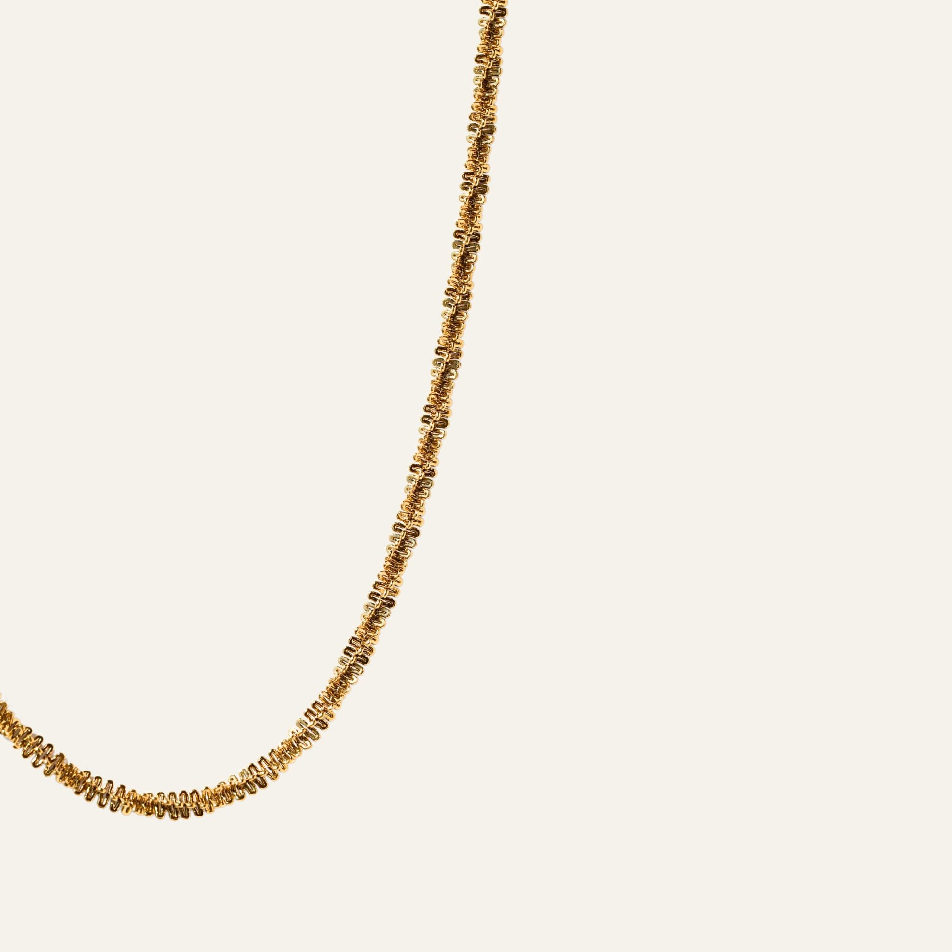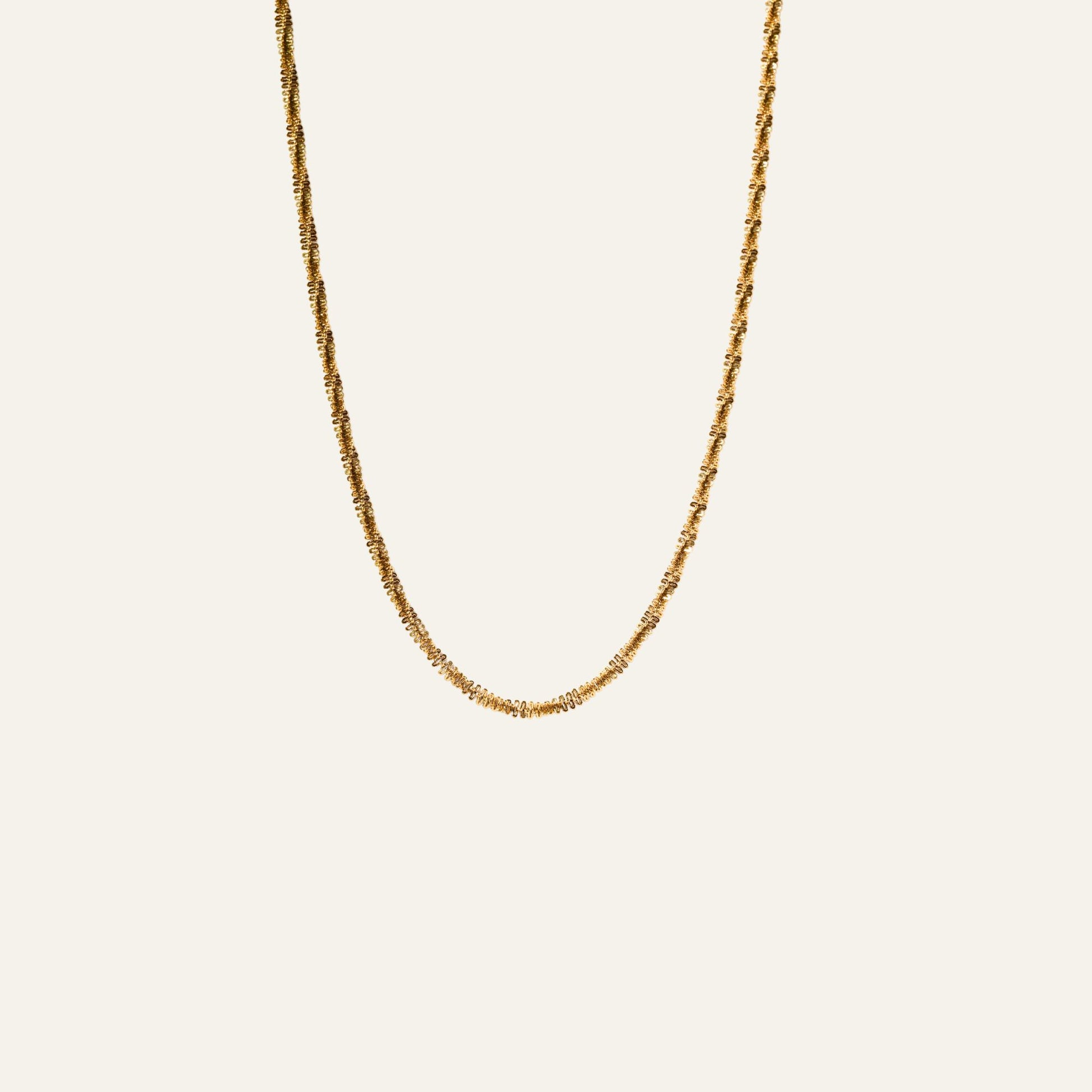 Bold Twist Chain Necklace är en kompakt och tvinnad kedja som fångar ljuset fint. Dess flexibla form ger ett levande intryck. Den vrider sig mjukt beroende på hur du rör dig, vilket gör varje stund med halsbandet unik. Perfekt för både vardag och kväll.