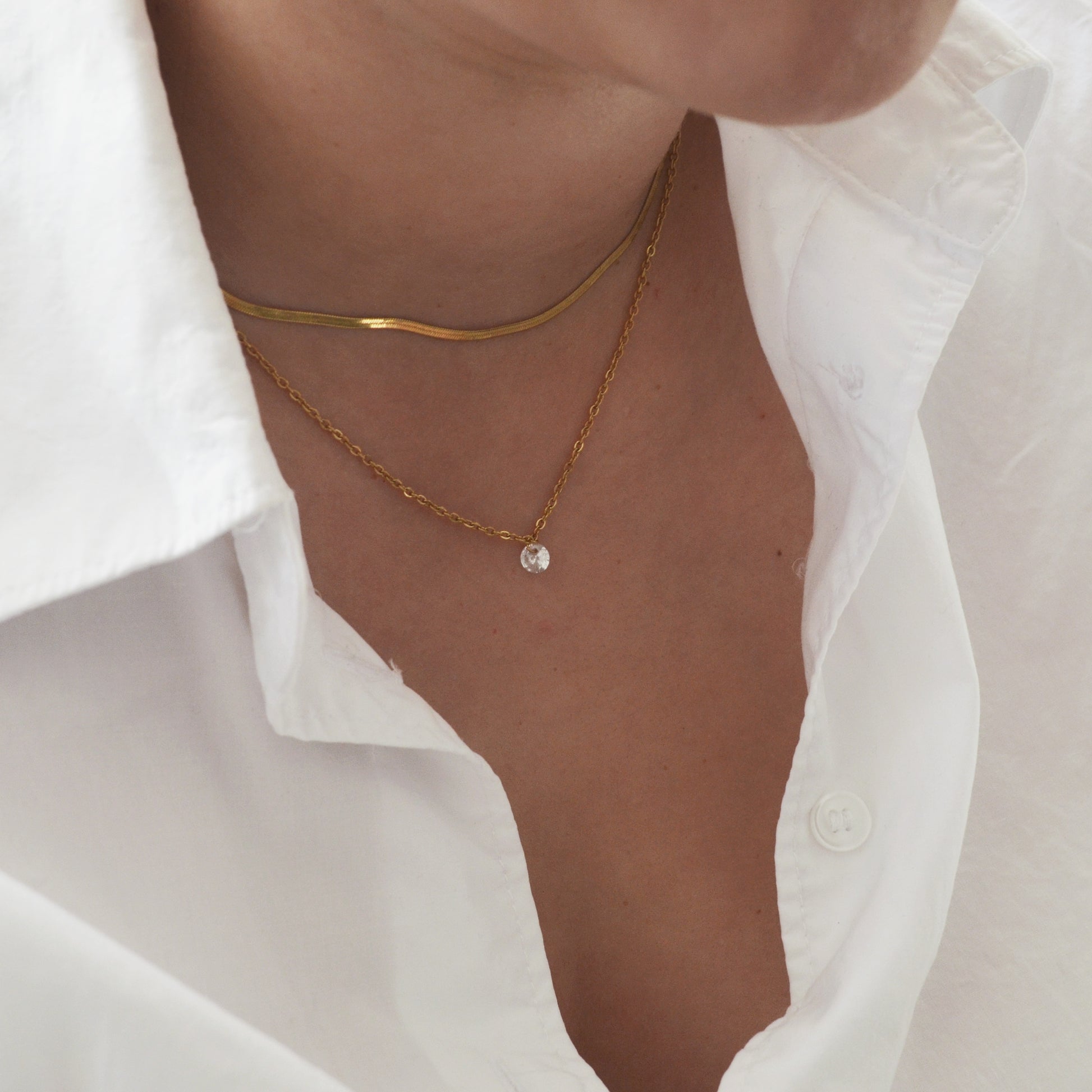Crystal Pedant Necklace består av en tunn guldkedja. Kedjan är dekorerad med en liten ziriconia kristall som hängsmycke. Kristallens storlek ger dig en diskret touch av elegans, som funkar perfekt att bäras varje dag.