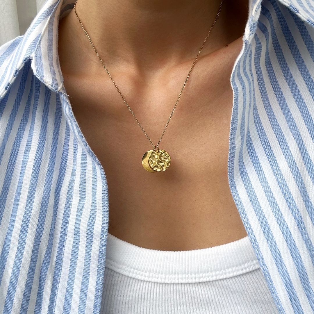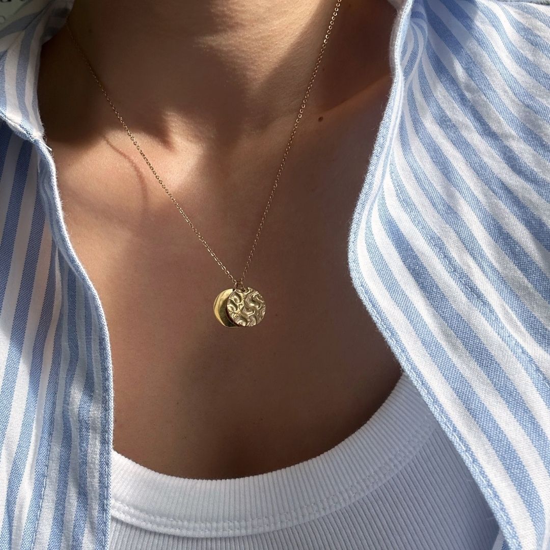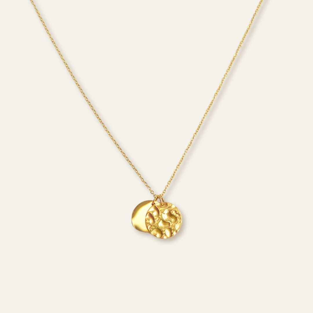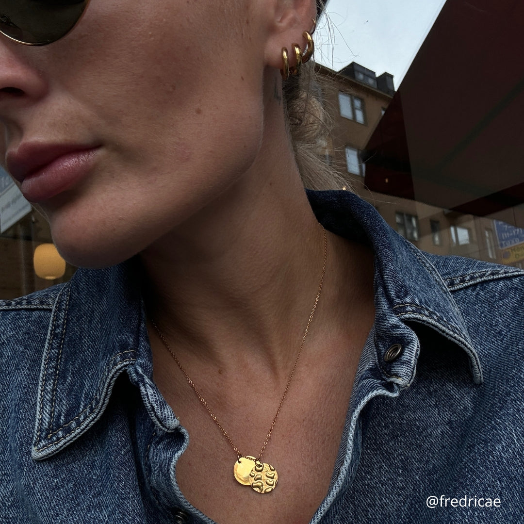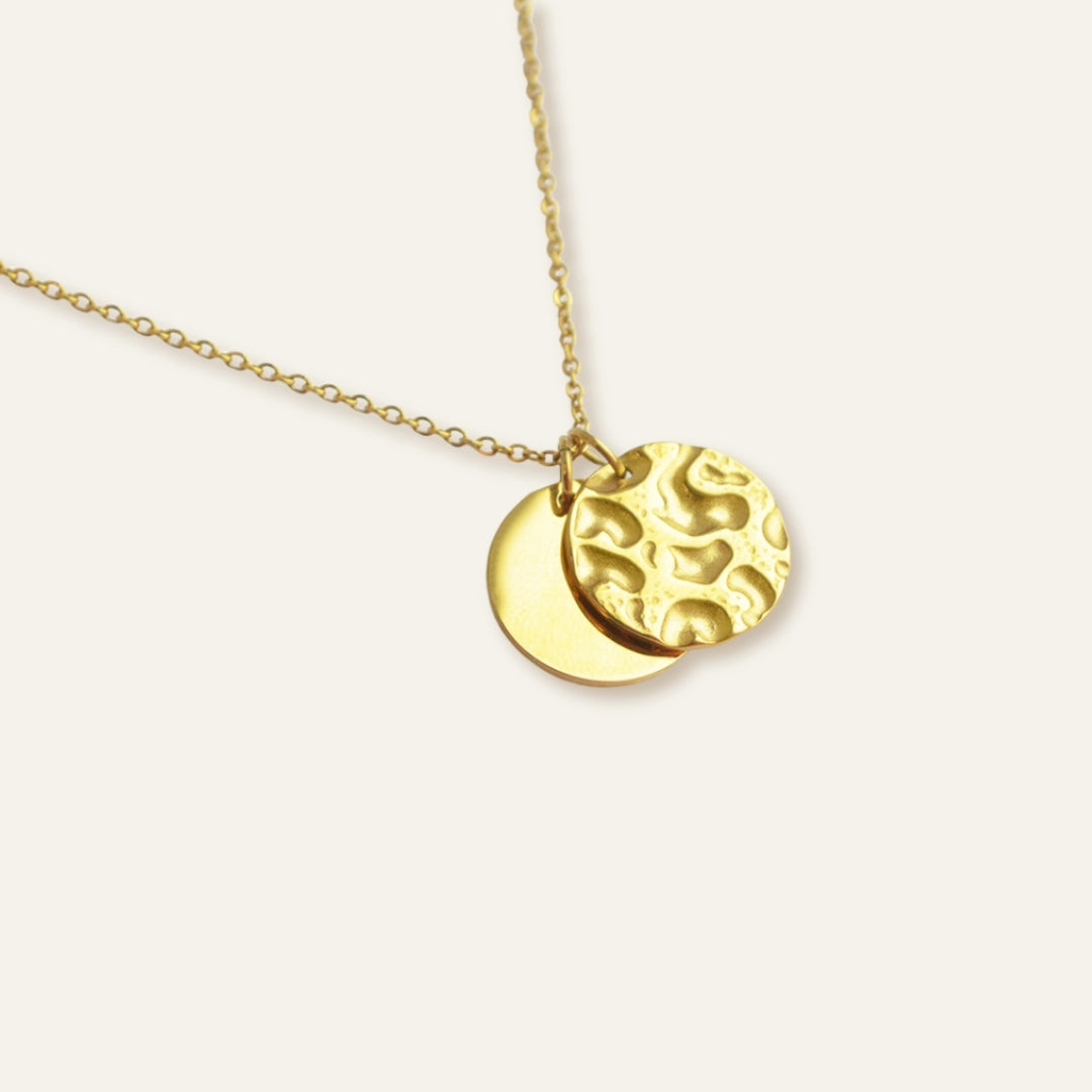 Noris Double Coin Pendant Necklace har två runda hängsmycken. Det ena med organiska mönster på ytorna och det andra med släta och blanka ytor. Designen är elegant och ger dig en tidlös touch.