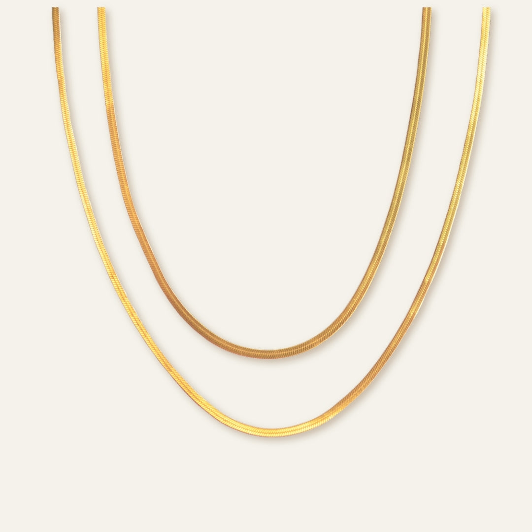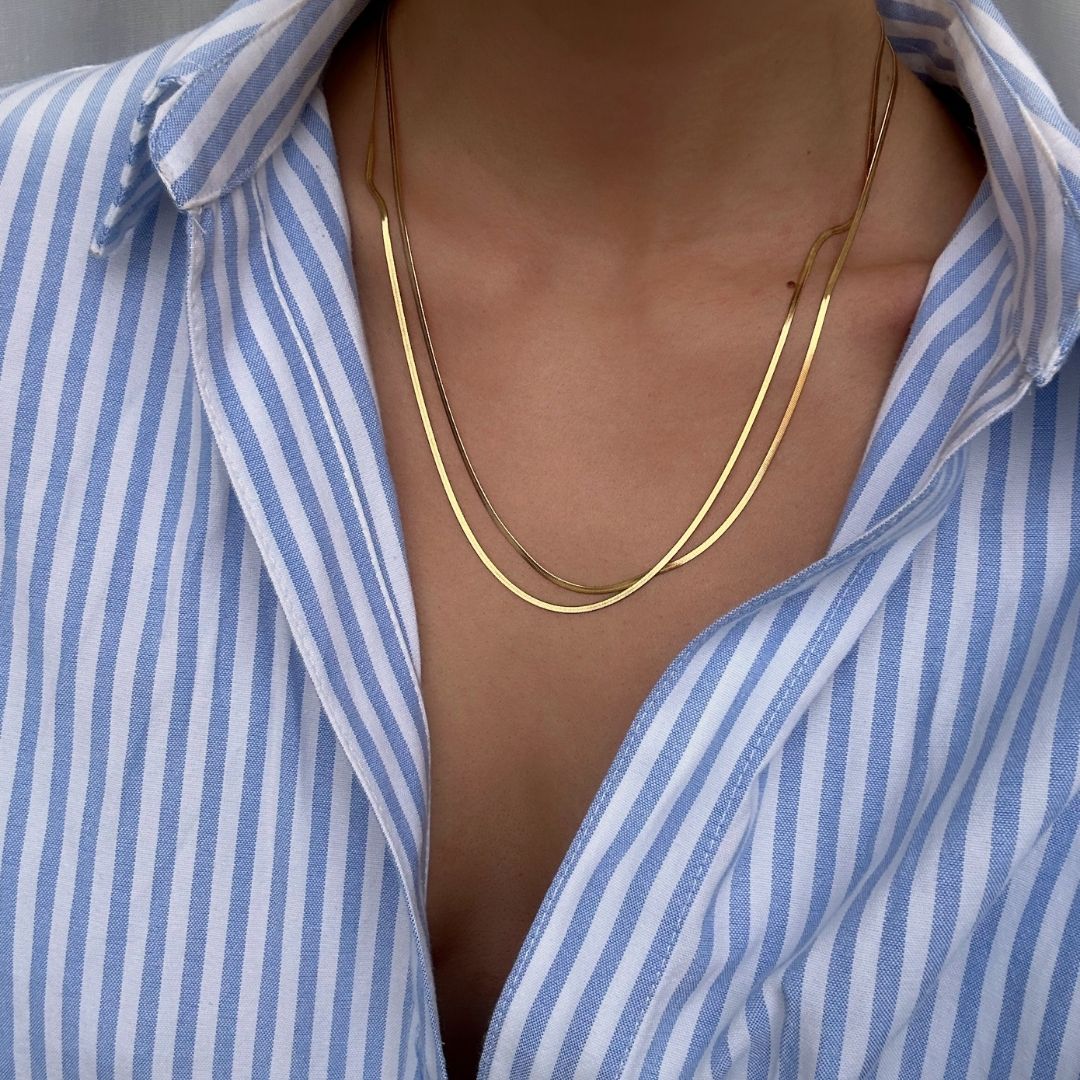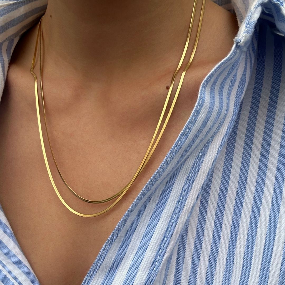 Precis som Thin Snake Chain Necklace tillför detta Double Thin Snake Chain Necklace elegans till varje look. Istället för bara en kedja har det här halsbandet två kedjor i olika längder. Det här är Noris senaste favorit.