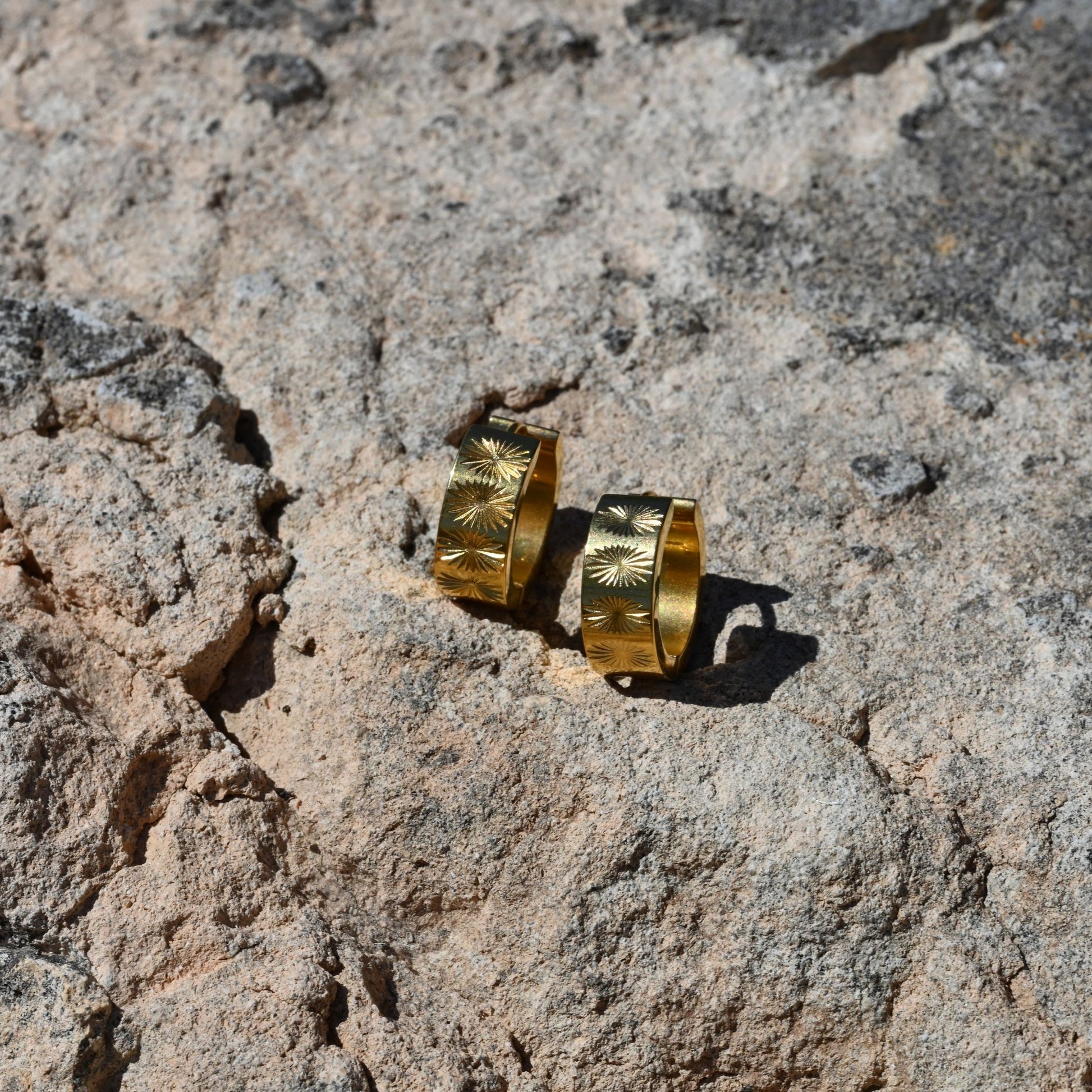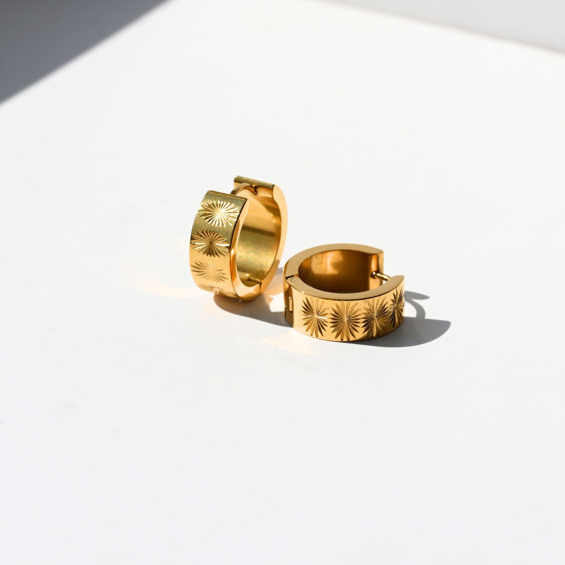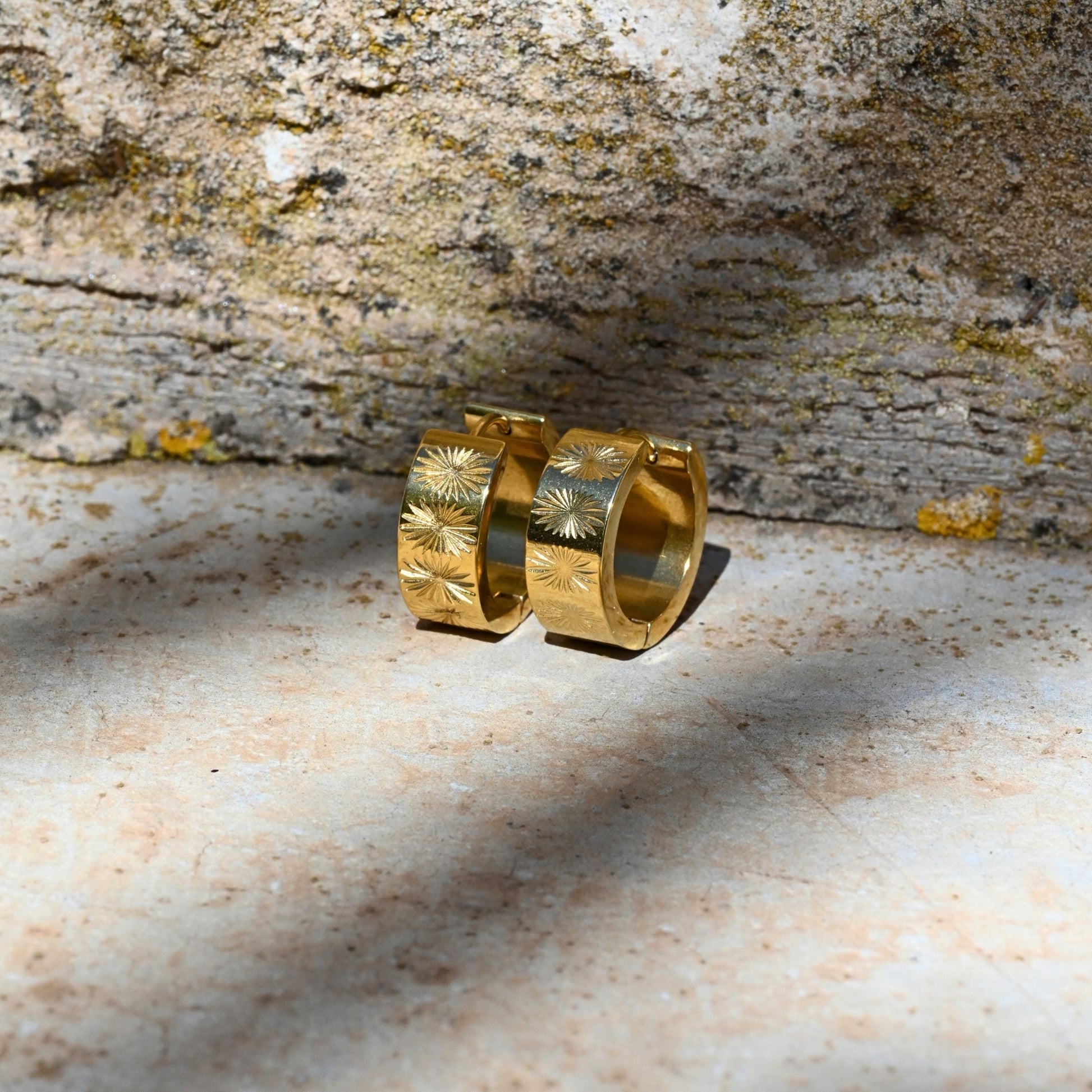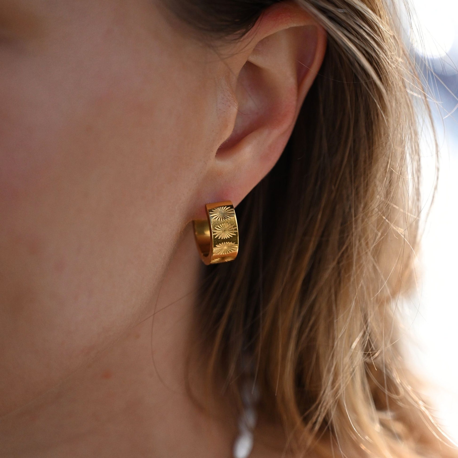 Large Sun Huggies är gjorda för att ge din look det lilla extra. De graverade solmotiven ger textur och gör att de skiljer sig från klassiska hoops. Lätta att bära både på stranden och på kontoret.