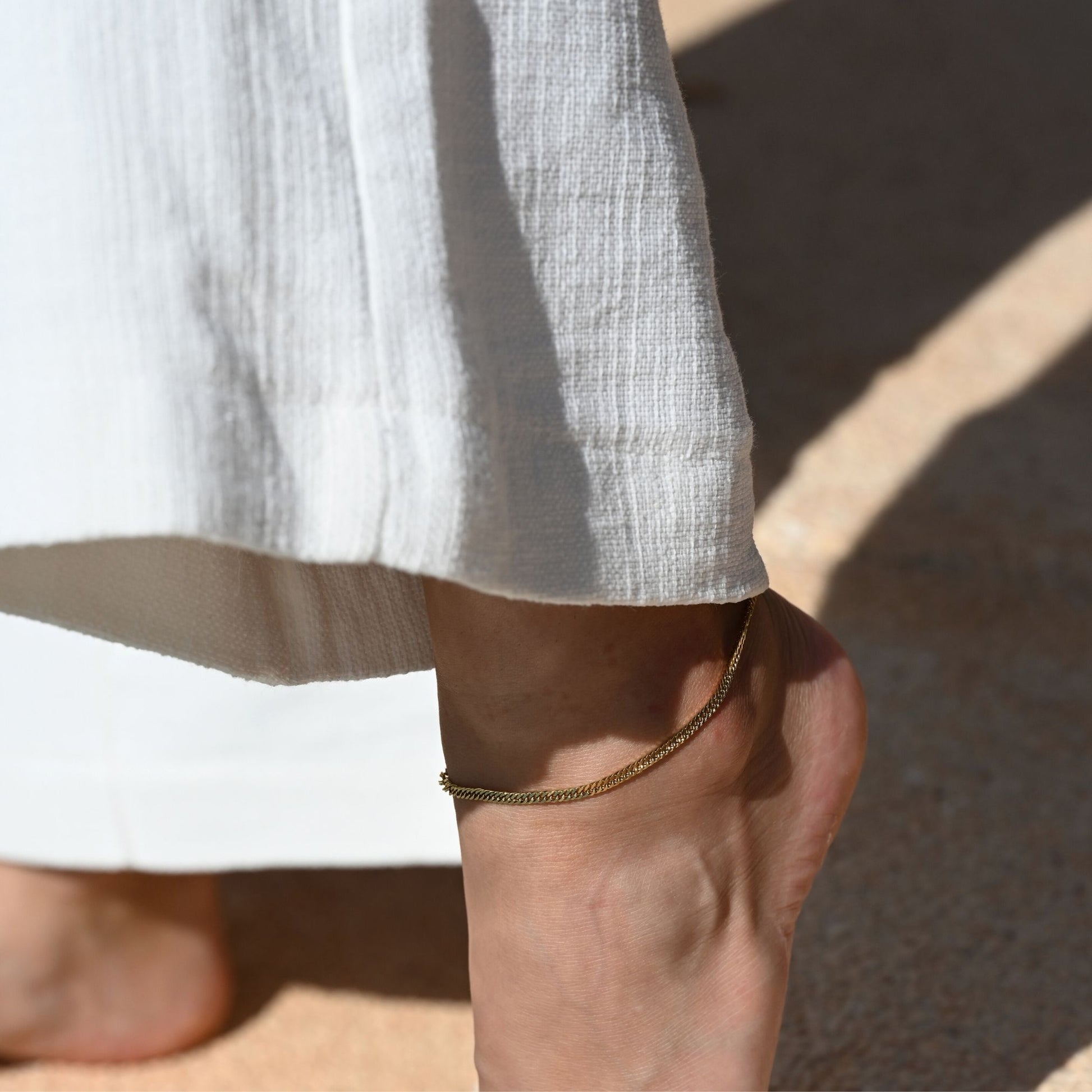 Minimalistic Chain Anklet är för dig som gillar en ren och klassisk look. Ett tidlöst smycke som ger precis lagom glans – perfekt för barfota dagar på stranden eller när du klär upp dig till middag.