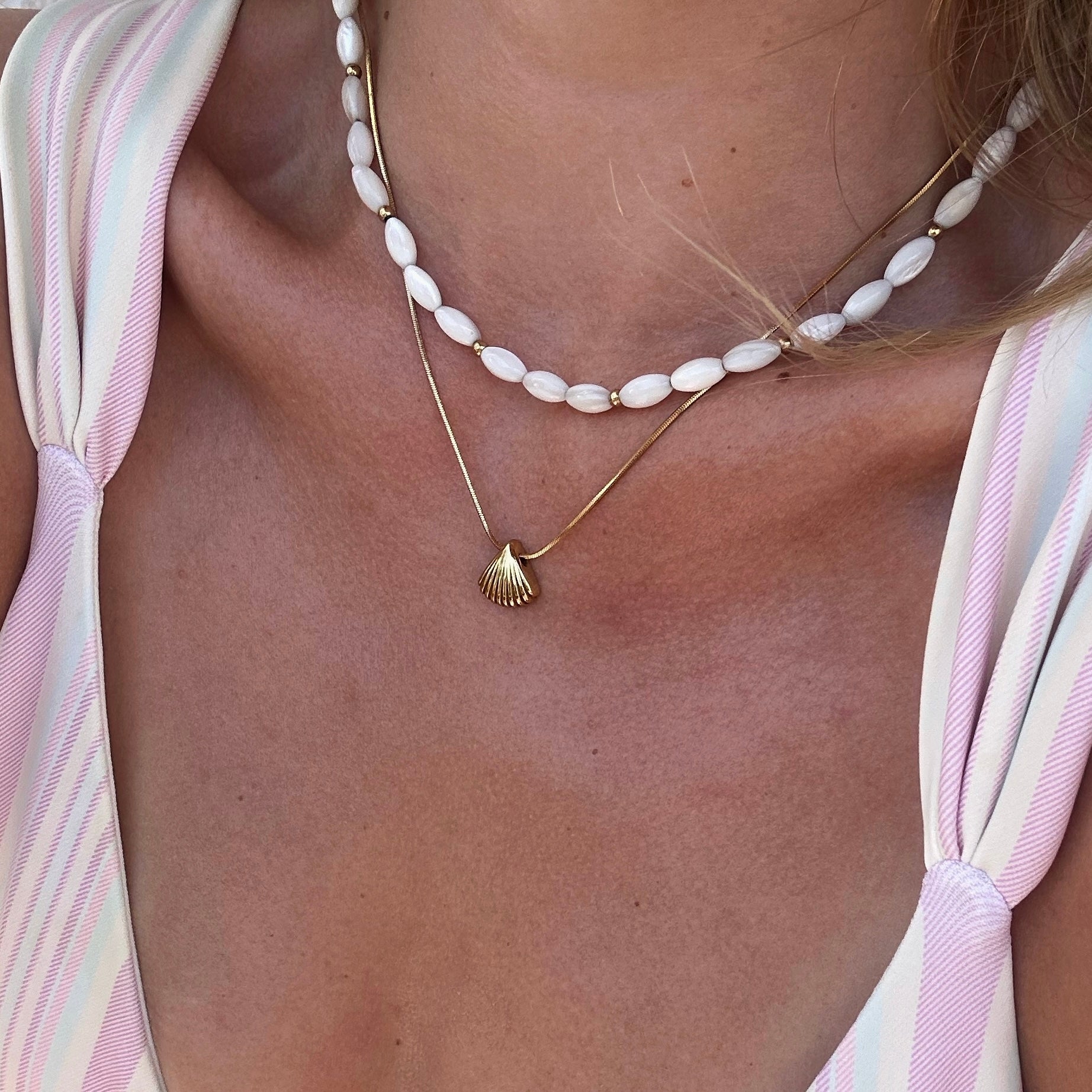 Oval Shell Pearl Necklace är gjort för att lysa upp din sommarlook. Pärlorna och de guldiga inslagen skapar en varm och avslappnad känsla. Ett halsband som passar lika fint till stranddagar som till somriga middagar.