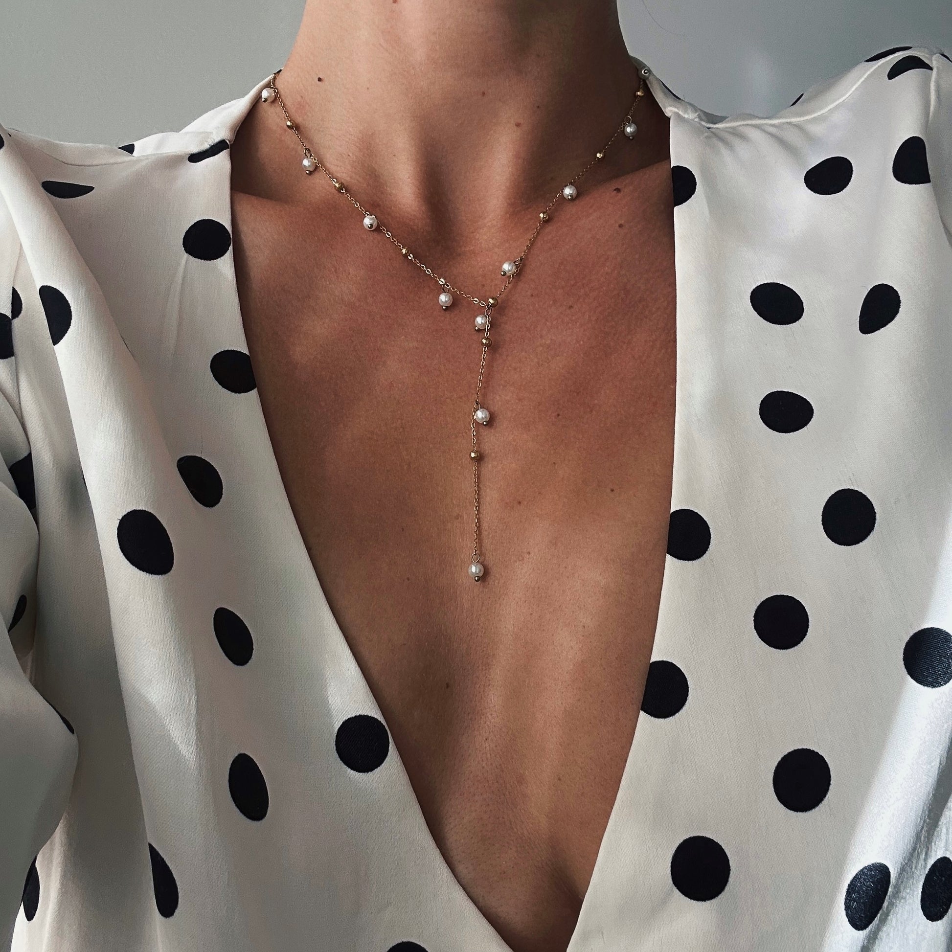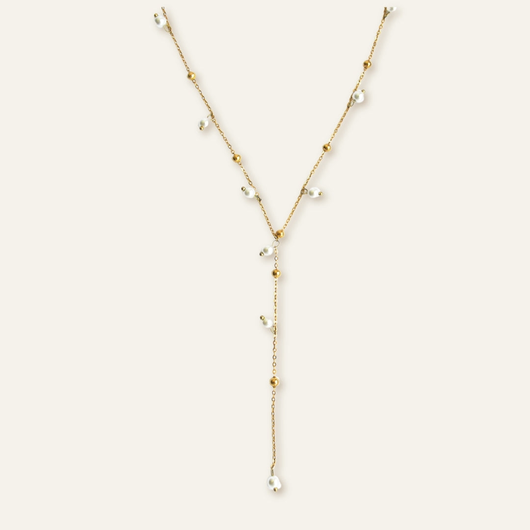 Pearls and Beads Y-halsband har en tunn kedja dekorerad med både vita pärlor och guldiga pärlor. Det perfekta halsbandet för en mer avslappnad look.