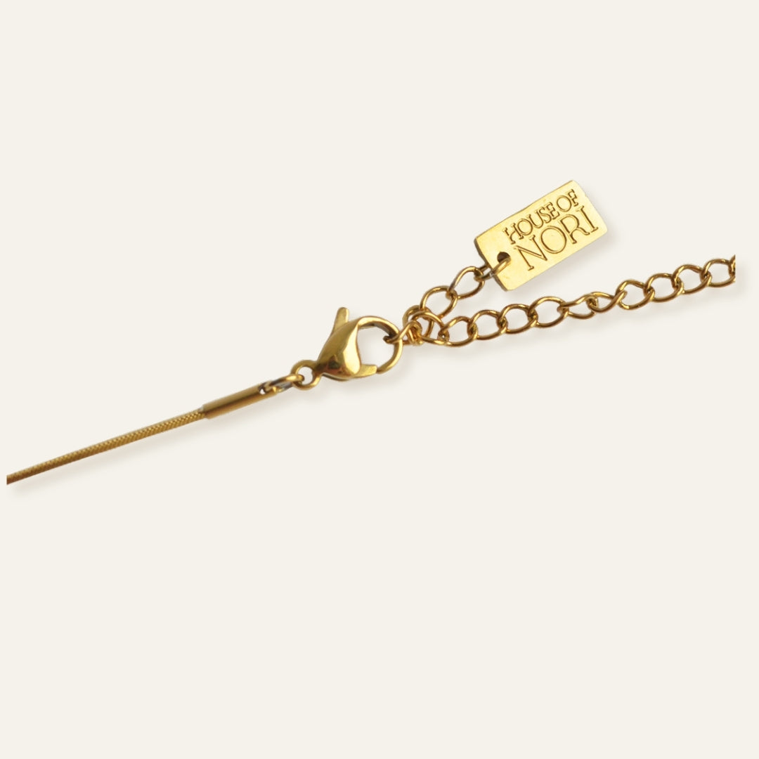 Alla smycken från House of Nori är tillverkade av Rostfritt Stål och har en 18K guldplätering. De är pläterade med den senaste terkniken som kallas PVD, vilket tilsammans med materialvalet gör alla smycken vattentåliga.
