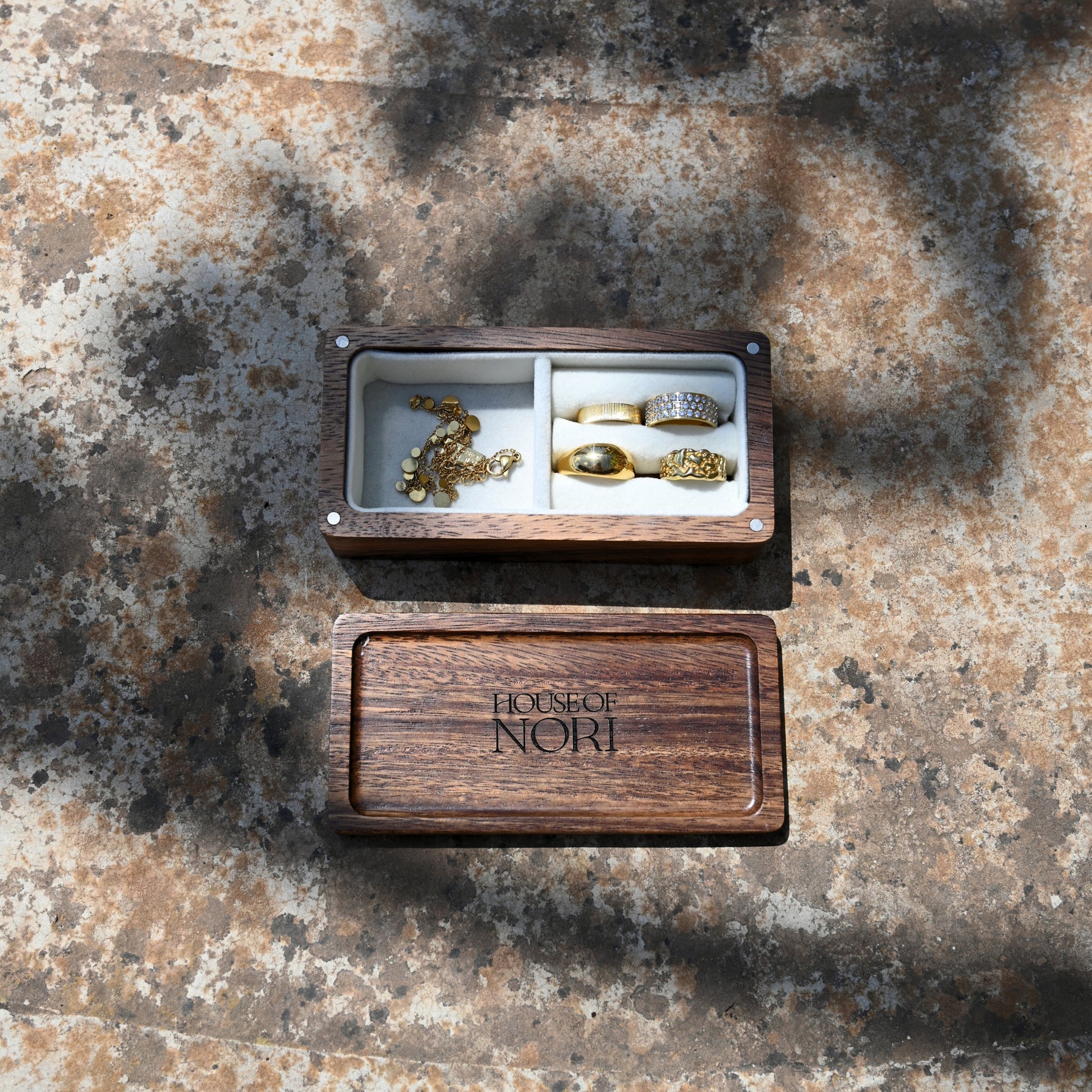 Notera: Varje smyckesask är tillverkad i naturlig valnöt, med sin egen unika ådring, ton och karaktär – ingen är den andra lik. Det är just denna stillsamma särprägel som gör varje ask alldeles unik.