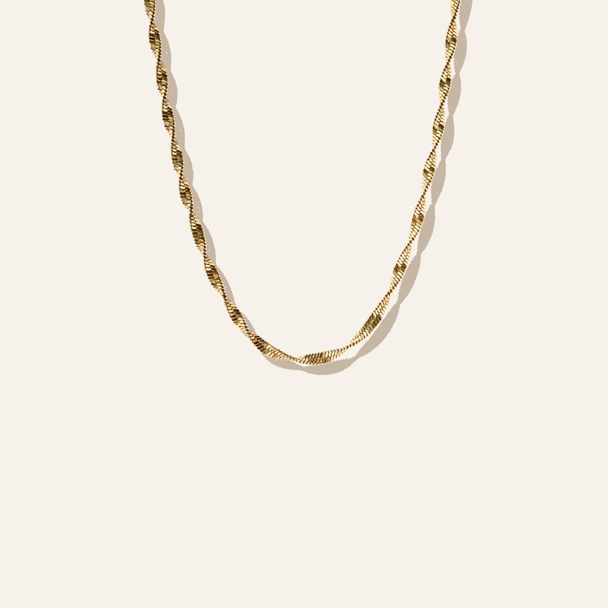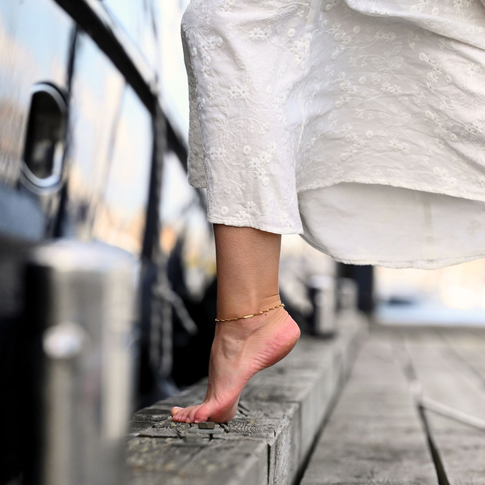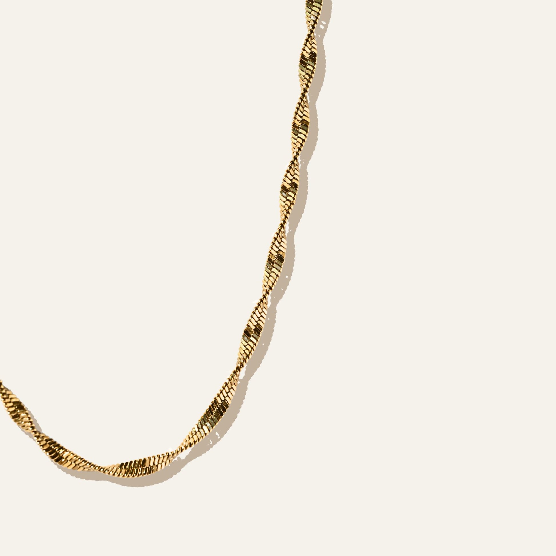 Twisted Chain Anklet består av en tunn guldkedja med en mjuk twist som fångar ljuset fint. En enkel och tidlös detalj – perfekt för stranddagar, sommarkvällar och allt däremellan.
