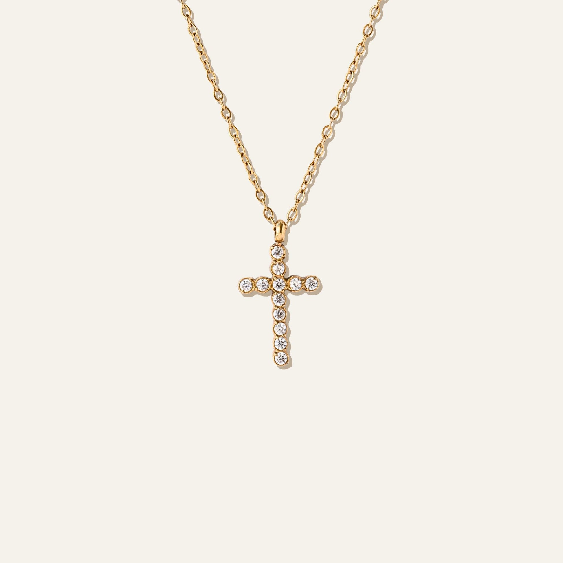 Zirconia Cross Necklace är ett elegant smycke prytt med klara zirconia stenar som fångar ljuset på ett vackert sätt. En tidlös design som känns både klassisk och modern. Bär det för sig själv eller tillsammans med andra halsband för en personlig look.